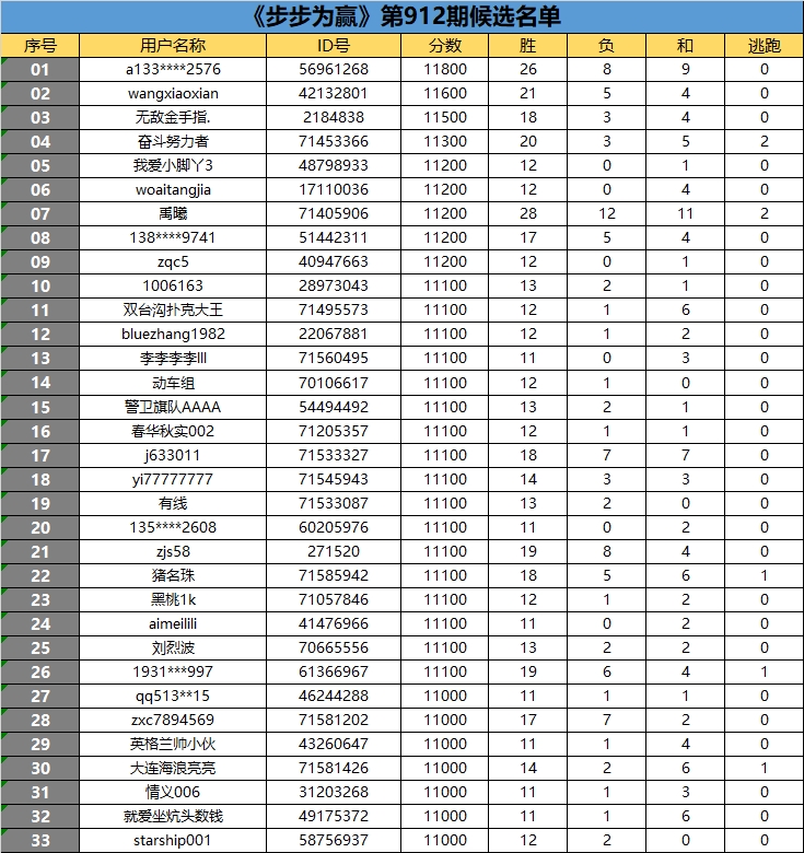 经过一周的激烈角逐,《步步为赢》第912期网络海选的33名候选选手已经揭晓。