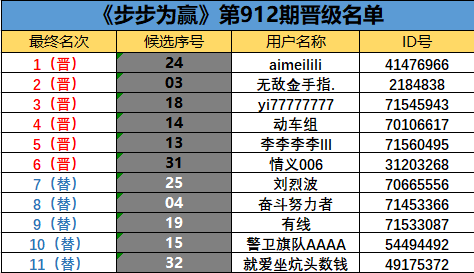 《步步为赢》第912期晋级名单公布
