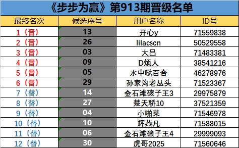 根据2025年11月20日中国福利彩票“双色球”玩法第25134奖结果,《步步为赢》第913期晋级名单已经产生。