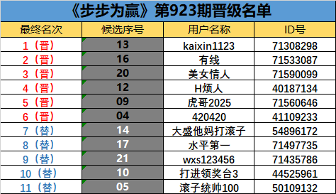 根据2026年1月29日中国福利彩票“双色球”玩法第26013奖结果,《步步为赢》第923期晋级名单已经产生。